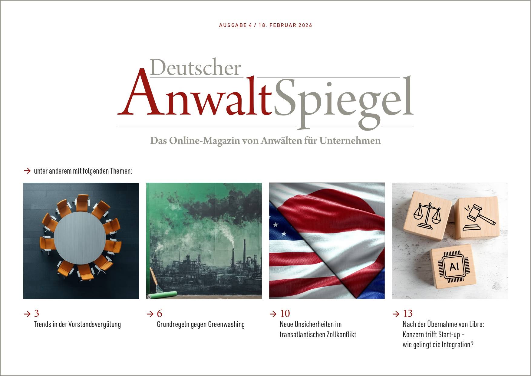 Trends in der Vorstandsvergütung • Grundregeln gegen Greenwashing • Neue Unsicherheiten im transatlantischen Zollkonflikt • Nach der Übernahme von Libra: Konzern trifft Start-up - wie gelingt die Integration? • Arbeitszeiterfassung (nicht nur) für angestellte Rechtsanwälte …