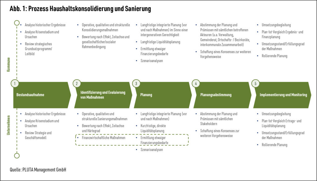 Ein strukturiert aufgesetzter Sanierungsprozess mit einer laufenden Überwachung der Planerfüllung dient im Anschluss an den Planungsprozess der Sicherstellung der langfristigen Durchfinanzierung auf beiden Ebenen sowie der frühzeitigen Identifizierung etwaiger Zusatzbedarfe. Dies versetzt die Kommune in die Lage, rechtzeitig die Stabilität der öffentlichen Unternehmen zu gewährleisten und Insolvenzen sowie Haftungsrisiken zu vermeiden. Sowohl Planungs- als auch Sanierungsprozess sind daher auf beiden Ebenen in enger Abstimmung zu erstellen und zu überwachen.
