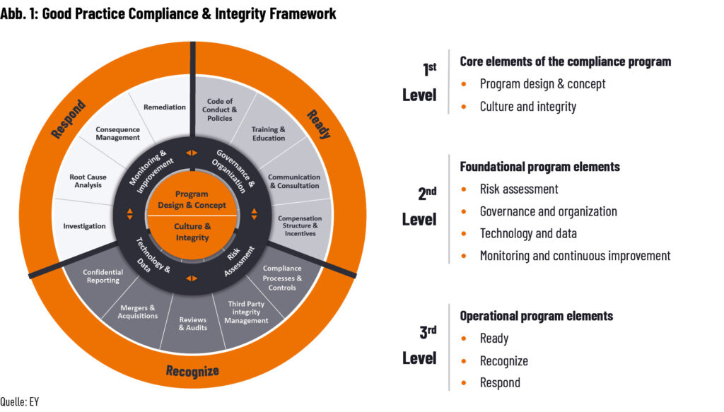 Strukturelles Compliancemanagement hat sich im Wesentlichen durch große Unternehmensskandale in den 2000er und 2010er Jahren entwickelt. Unterschiedlichste Standardsetter, Behörden und NGOs haben umfassende Anforderungen an das klassische Compliancemanagement definiert, die Unternehmen sukzessive entwickelt und umgesetzt haben. Durchgesetzt hat sich ein klassisches „Prevent-Detect-Respond“-Modell, das regulatorische Compliancerisiken und verstöße frühzeitig ins Auge fasst und managt, bis hin zur Internal Investigation. Auf dieser Grundlage und bei einer überschaubaren Anzahl an Compliancerisikofeldern hat sich ein etabliertes Compliance-Governance-und-Operations-Modell entwickelt, auf das sich Unternehmen verlassen können (Abb. 1).