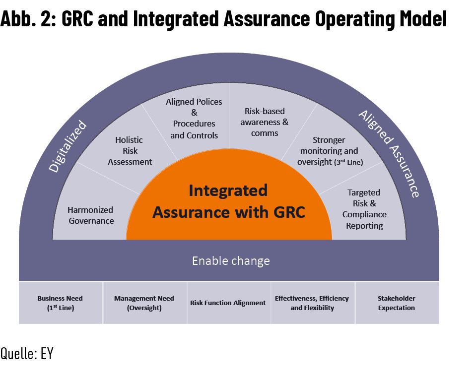 - Der letzte und wichtigste Punkt ist eine abgestimmte Corporate Governance: ein holistisches Verständnis, wer Risikoowner und Risikomanager im Unternehmen ist und wie Interdependenzen zwischen Abteilungen und Organisationseinheiten vereinheitlicht und abgestimmt werden (Abb. 2).