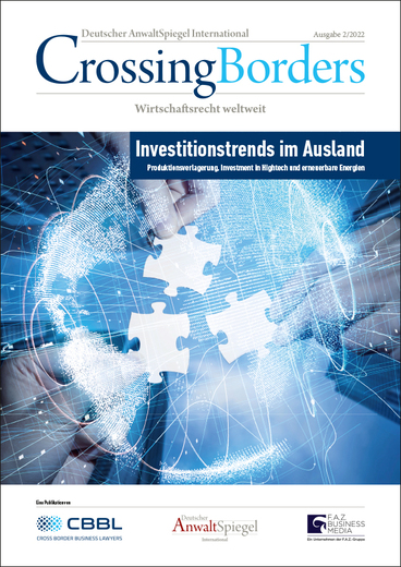 Ausgabe 2/2022 von CrossingBorders befasst sich mit Investitionstrends im Ausland und blickt unter anderem auf das Thema Produktionsverlagerung sowie Investments in den Bereichen Hightech und erneuerbare Energien.