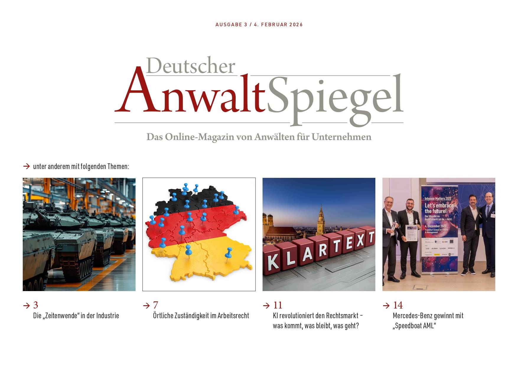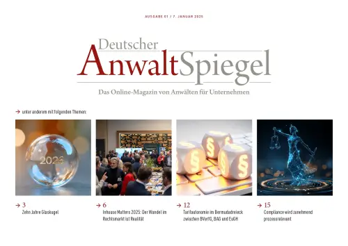 Die Fachpublikationen der Produktfamilie Deutscher AnwaltSpiegel liefern Ihnen regelmäßig wertvolles Praxis- und Expertenwissen zu allen Bereichen des unternehmensrelevanten Rechts, wie deutsches und europäisches Wirtschafts- und Gesellschaftsrecht, Arbeitsrecht, Compliance, Marken- und Patentrecht, Insolvenzrecht, Streitbeilegung, Digitalisierung und Nachhaltigkeit.
